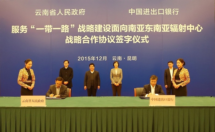 2015年12月24日,进出口银行与云南省政府在昆明签署了《服务“一带一路”战略 建设面向南亚东南亚辐射中心战略合作协议》。