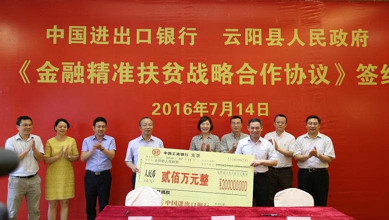 胡晓炼董事长和云阳县委、县政府领导共同见证了《金融精准扶贫战略合作协议》、《PVB项目贷款合同》和《2016年定点扶贫捐赠协议》的签约仪式。bte365官网将为云阳的重大项目和重点企业提供50亿元的信贷额度支持,并捐赠了200万元专项资金。