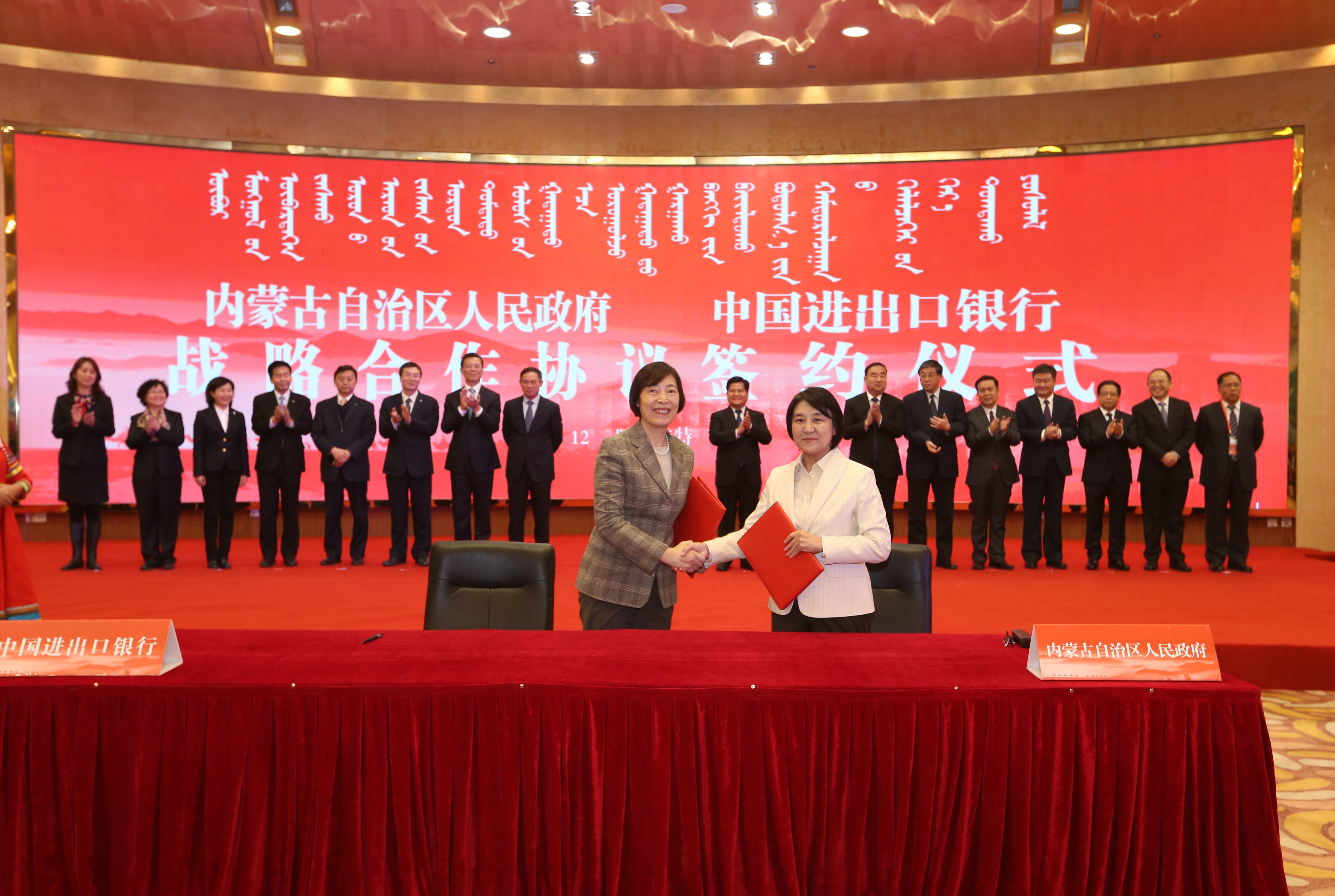 会后,胡晓炼董事长和布小林主席分别代表进出口银行与内蒙古自治区人民政府签署了《战略合作协议》。根据协议内容,双方将在资源、技术和设备进口,农产品、高新技术产品及成套设备出口,企业“走出去”,服务贸易,转型升级,贸易融资等领域开展深入合作,未来五年内进出口银行将加强对内蒙古自治区铁路、公路、航空、市政、水利、能源、信息通讯等七大网络体系建设的信贷支持。内蒙古自治区政府将为进出口银行参与自治区外向型经济发展提供良好的社会信用机制,鼓励自治区进出口企业争取进出口银行融资支持,为进出口银行参与自治区外向型经济发展创造有利条件;进出口银行将结合自治区区位特点、资源禀赋优势,加大对内蒙古自治区企业外向型经济的支持力度。随后,进出口银行内蒙古自治区分行与呼和浩特市人民政府、呼和浩特铁路局分别签署了《战略合作协议》。